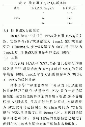 张冰如等〔20〕同样评价了PESA对CaCO3的阻垢性能。分析结果表明:PESA阻CaCO3垢的效果优于一些常用的聚羧酸类、磺酸盐类、聚磷酸类阻垢剂,而且也比美国清力公司生产的能阻CaCO3、CaSO4、BaSO4、Sr2SO4多种垢的多元阻垢剂PTP-2000好。