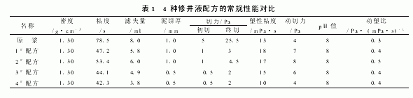 3)ÐÞ¾®Òº´¦Àí¼Á×î¼ÑÓÃÁ¿µÄÈ·¶¨ ¸ù¾Ý²àб¾®µÄµØ²ãÌØÐÔ¼°¶Ô¸ß¾ÛÎïÐõÄý¼Á¡¢·ÀËú¼ÁºÍ½µÂËʧ¼ÁµÄÓÅÑ¡½á¹û£¬ÒÔ²»Í¬µÄ¼ÓÁ¿ÑÐÖÆ¸´Åä³ö4ÖÖÐÞ¾®ÒºÅä·½(1#Åä·½£º»ù½¬+015%NPAN+05%SKCM+01%M101+03%JNA£»2#Åä·½£º»ù½¬+03%NPAN+08%SKCM+01%M101+03%JNA£»3#Åä·½£º»ù½¬+03%NPAN+10%SKCM+01%M101+03%JNA£»4#Åä·½£º»ù½¬+03%NPAN+10%SKCM+015%M101+03%JNA)¡£Æä³£¹æÐÔÄܼû±í1¡£