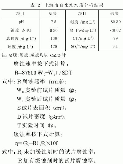 参照《中华人民共和国化工行业标准水处理剂缓蚀性能的测定-旋转挂片法》HG/T2159-91,在动态腐蚀测试仪上进行缓蚀性能实验,温度45℃,转速75r/min,碳钢试片:A3碳钢50mm×25mm×2mm。实验用水:上海市自来水,水质分析见表2。