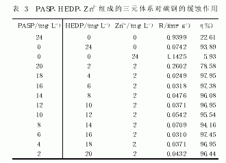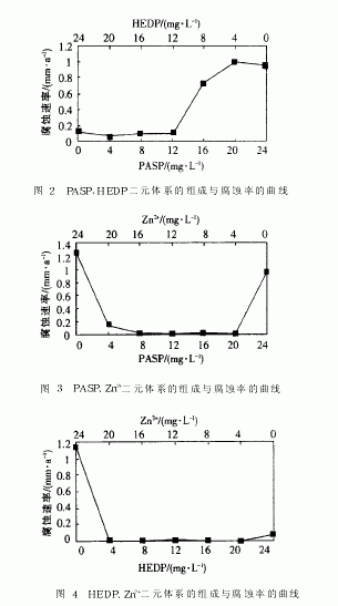 (2)在PASP、HEDP、Zn2+组成的三元体系中,PASP与HEDP的配比在相当宽的范围内,其腐蚀率<0.05mm/a,达到比较好的缓蚀水平。说明该PASP、HEDP、Zn2+三元体系具有更显著的缓蚀协同效应。