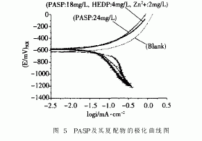 图5是24mg/L聚天冬氨酸及其复配物在自来水中的极化曲线图,可看出,加入聚天冬氨酸后自腐蚀电位向正移,且阳极极化曲线的斜率增大,故属于阳极型缓蚀剂;与HEDP和锌离子复配后,自腐蚀电位基本与单独使用PASP的电位重合,且较空白试样正移,因此该复合缓蚀剂属阳极型缓蚀剂,该极化曲线的阴极极化有所加强,因此缓蚀率增大。