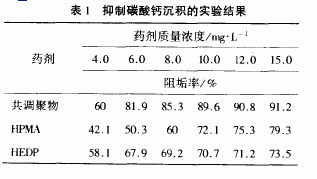 从表2可知,共凋聚物具有良好的阻磷酸钙垢性能,并且存在“临界效应"。在临界浓度8.0mg/L以下,共调聚物对磷酸钙垢的阻垢能力较差,浓度增至临界浓度时,其对磷酸钙垢的阻垢率发生突变,阻垢性能远远优于HPMA和HEDP,说明磺酸基团的引入有利于抑制磷酸钙垢的生成。