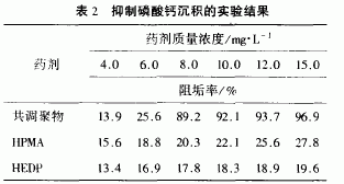 按照1.3.2的条件对共调聚物阻磷酸钙垢的性能进行了评定,并与HPMA、HEDP进行了比较,实验结果见表2.