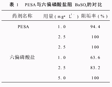 Betz实验室的BrownJM等在[Ba2+]为2mg/L,[SO42-]为1000mg/L,pH为5.5,温度为60℃的条件下,进行了PESA的静态阻BaSO4性能实验,实验对比结果如表1所示.