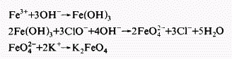 制备原理:以铁盐和次氯酸盐(如NaCIO、KCIO)或氯气为原料,在碱性溶液中反应制备高铁酸钾。其反应式如下: