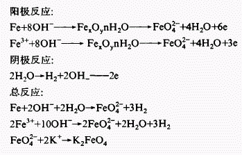 制备原理:在铁制阳极发生氧化反应。将铁或Fe3+氧化成FeO]42-。再在阳极液中加入KOH。使高铁酸钾沉淀出来。