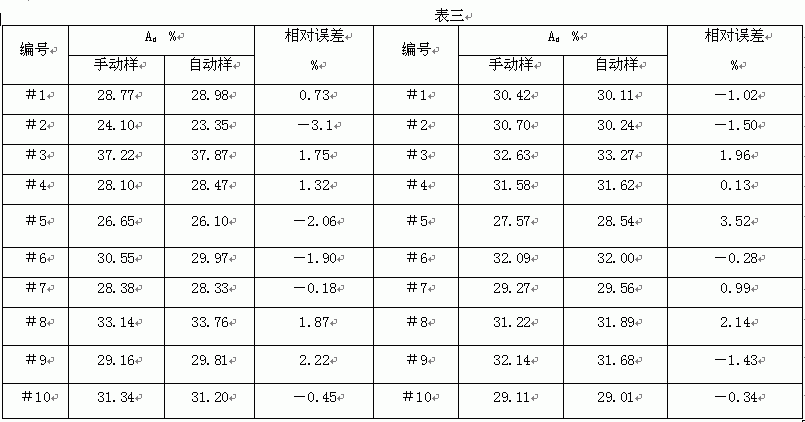根据ISO1988-1975(E)《硬煤-采样》推荐的参比方法,我厂采用停皮带人工采样与自动采样装置采样相比较的方法,分别取得10个样进行煤样灰分试验,测得数据如下表所示: