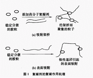 一般认为高分子絮凝剂的絮凝作用机理是:在稳定的胶体分散体系中,1个长链大分子可同时吸附2个或几个胶粒,或是1个胶粒可同时吸附2个高分子链,因而形成“架桥"的形式把胶粒裹集起来而聚沉(如图1(a));也可能是大分子链中的极性基团在胶粒表面上进行无规则吸附而使胶粒聚沉(如图1(b))。此外,有的絮凝剂也有中和悬浮物质电荷的作用。