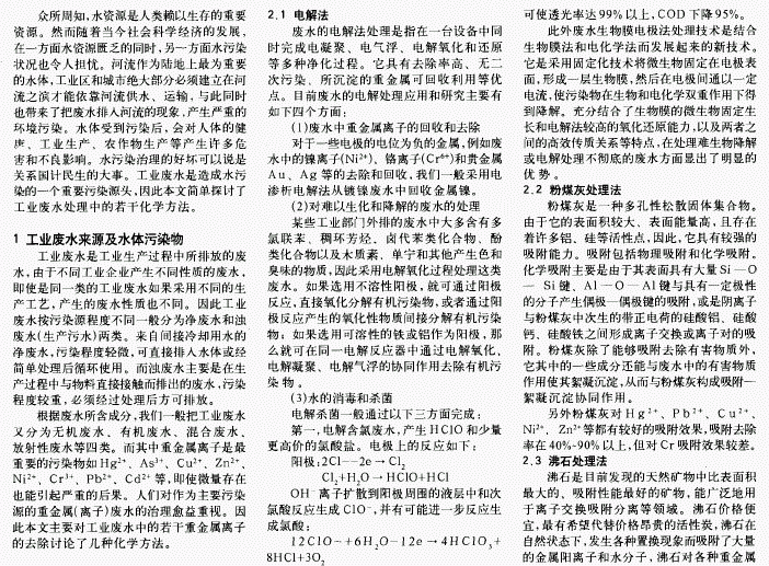 工业废水处理中的若干化学方法研究 西门观止 / 2017-01-01 浏览 工业废水污染是水污染的主要污染源之一。本文从工业废水来源及水体污染的简单阐述出发,探讨了在废水处理中采用的若干种化学方法。最后简单阐述了研究工业废水处理方法的重要意义。 阅读全文