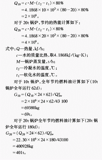(1)冷凝水回收节约燃料油。利用冷凝水的余热。冷凝水温度平均80℃,软化水平均温度20℃,回收率80%。对于10t锅炉,节约的热能计算如下: