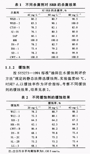 孤东油田目前使用的药剂(缓蚀阻垢剂SL一2B、SL一2C与杀菌剂SJ一01、CTIO一1)在初期有一定的效果,但随着时间延长,经这些药剂处理后,水质达标率低,不能较好地满足孤东油田注水水质的要求。因此,复配与筛选高效的污水处理剂,对提高注水水质,改善注水使用效果具有十分重要的意义。