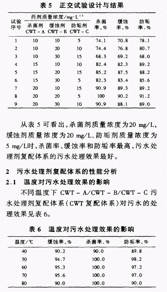 在以上试验的基础上,为确定污水处理剂复配体系最佳单剂质量浓度,以杀菌剂CWT—A、缓蚀剂CWT—B、防垢剂CWT—C的质量浓度为因素,设计3因素3水平正交试验,结果见表5。