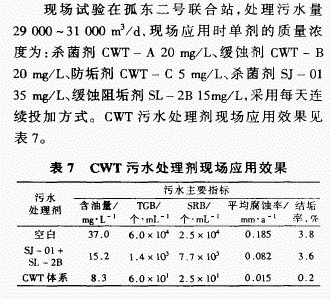 由表7可看出,采用CWT复配体系污水处理剂后,细菌含量比SJ一01/SL一2B原药剂降低2个数量级,平均腐蚀率和结垢率也大大降低;与空白相比,腐生菌(TGB)含量由6.0×104个/mL下降为6.0×10个/mL,SRB含量由2.5×10个/mL下降为2.5×10个/mL,杀菌率高达99.9%,平均腐蚀率由0.185mm/a下降至0.015mm/a,缓蚀率达91.9%,结垢率由3.8%降至0.2%,防垢率为94.7%,总体水质达标率由33.3%提高到88.9%,具有明显的处理效果。