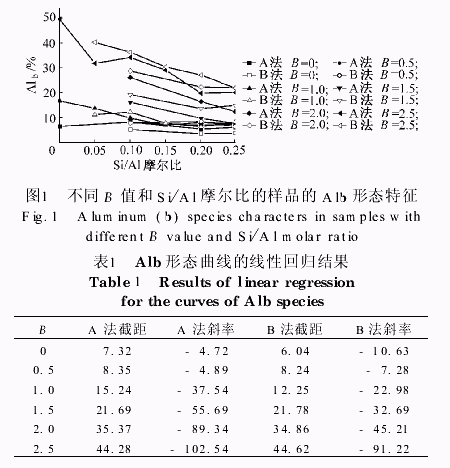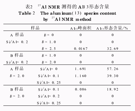 与Ferron逐时络合比色法测定的Alb形态含量结果相比,27AlNMR法测定的Al13形态含量低于Alb形态含量,而且这种差别在低B值及高Si/Al摩尔比情况下更大.这是因为Al-Ferron法所测定的Alb形态不只包括27AlNMR法测得的Al13形态,还包含了一些聚硅与水解铝离子相互作用形成的一些新形态,且B值越低,这些新形态所占的比例越大.另外,两种方法样品的27AlNMR谱图计算得到的形态含量结果中,B样品的Al13形态含量低于A样品,而由2.1结论知B样品的Alb形态含量却高于A样品,说明B样品中聚合度介于Al单和Al13之间的铝硅结合的新产物较A样品中的多或所占比例大.以往的研究证明,Al13形态为絮凝反应的优势形态,由此推理,A样品应比B样品絮凝效能高,这已在文献中得到证实.