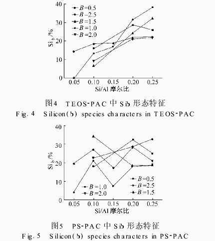 3)两种样品的Alb形态和Sib形态含量随Si/Al摩尔比变化的程度都取决于B值,但铝形态和硅形态的变化方向却相反,且新型聚硅氯化铝样品的Sib形态特征规律比传统聚硅氯化铝样品更明显.