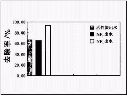 由图1可知,在TOC的去除效果上,活性炭对TOC有一定的去除效果,但仍有一部分未能去除;纳滤NF1对TOC的处理效果较好达到93.9%;而纳滤NF7对TOC的处理效果不够理想。