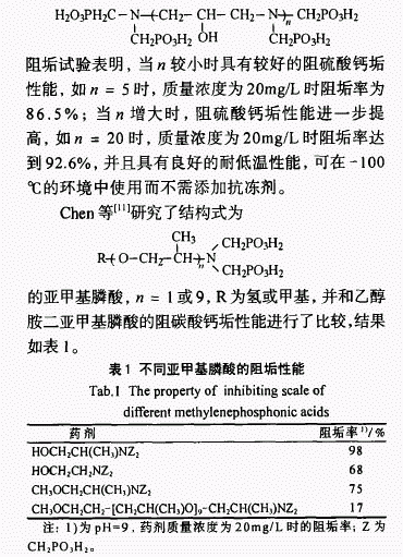 李寿椿研究了氨基三亚甲基膦酸(ATMP)、亚氨基二亚甲基膦酸(IDPA)和氨基亚甲基膦酸(AMP)的阻垢缓蚀性能,得出ATMP阻碳酸钙垢性能最佳,IDPA缓蚀性能最佳,AMP阻垢和缓蚀性能都很差。而结构相似的氨基羧酸则不具有阻垢和缓蚀性能。