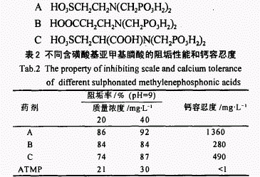 美国Calgon公司研究了结构式如下的含磺酸基亚甲基膦酸的阻碳酸钙垢性能及钙容忍度,试验结果见表2。