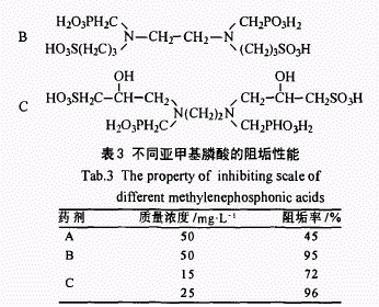 亚甲基膦酸。阻垢试验结果表明,这3种亚甲基膦酸具有接近于2一膦酰基丁烷.1,2,4.三羧酸(PBTC)的阻碳酸钙垢性能,阻垢性能良好。