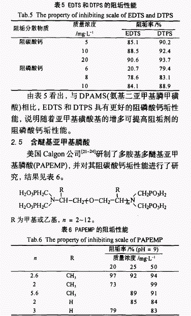Petrolite公司研究了相对分子质量为2000、3 000的PAPEMP,阻垢试验表明其阻垢性能只与市售的有机磷酸阻垢剂相当。