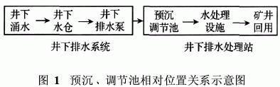 在矿井排水处理中,为了调节水量、均衡水质,水处理工艺的前端往往设有调节池,由于该构筑物还具有一定的沉淀作用,故常常被称作为预沉调节池(其相对位置关系见示意图1)。合理的设置预沉调节池不仅能保证处理站安全、稳定、灵活的运行,而且能优化水处理设备能力,降低工程投资。下面就井下排水处理中设置预沉调节池的必要性以及设计中需注意的有关问题作以探讨。
