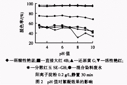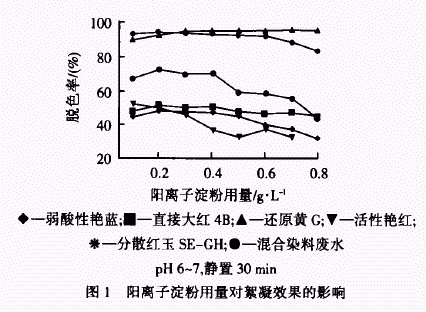 由表 1 可知﹕陽离子淀粉對還原和分散染料的絮凝效果較好,脫色率達到 96%以上﹔對活性、酸性、直接染料的絮凝效果一般,脫色率在 55%左右﹒原因是還原和分散染料屬于不溶性染料,它們在廢水中以顆粒形式存在,通過陽离子淀粉絮凝劑的吸附、中和、架橋作用易形成較大的絮凝体沉降下來﹔而活性、酸性、直接染料屬于真溶性染料,它們在廢水中以分子狀態存在,与還原和分散染料相比,不易形成較大絮凝体﹔陽离子淀粉對混合染料廢水的脫色率為 75﹒3%,优于對活性、酸性、直接染料的絮凝能力,低于對還原和分散染料的絮凝性﹒