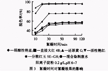 由圖 3 可以看出,延長絮凝時間,絮凝效果變好,但 30 min 后脫色率變化不大﹒所以确定最佳絮凝時間為 30 min﹒