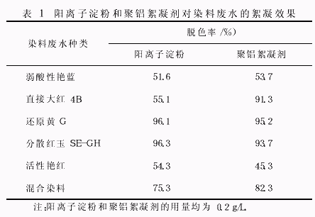目前比較常用的絮凝劑主要是聚鋁絮凝劑﹒本試驗選聚鋁絮凝劑与陽离子淀粉進行絮凝效果比較﹒參照陽离子淀粉的最佳絮凝工藝處理染料廢水,結果如表1所示﹒