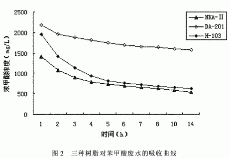 由图2可以看出,NKA-Ⅱ以及H-103大孔吸附树脂对含苯甲酸废水的吸附能力较DA-201大孔吸附树脂好.在相同时间,用NKA-Ⅱ及H-103大孔吸附树脂吸附后的苯甲酸废水浓度明显比DA-201大孔吸附树脂低.NKA-Ⅱ树脂处理苯甲酸后浓度去除率为82.1%,H-103树脂处理苯甲酸后浓度去除率为78.7%,DA-201树脂处理后的为47.6%.考虑到NKA-Ⅱ大孔树脂的价格比较高,所以处理废水采用H-103大孔吸附树脂将更加经济且效果比较好.