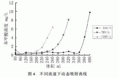 3.3 流速对树脂吸附性能的影响在相同条件下即废水浓度为3000mg/L,吸附温度恒定下采用5BV/h、7BV/h和10BV/h吸附流速进行动态吸附实验.