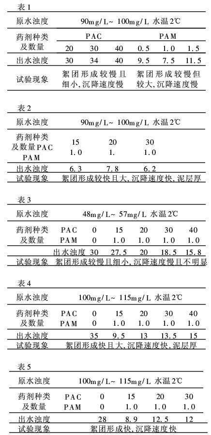 模拟实际情况,水温3~15℃,向不同浊度(<57mg/L、57mg/L~100mg/L,>100mg/L)的原水投加已配制好的不同种类、不同剂量、不同比例的絮凝剂,充分混合观察浊水中絮团的形成情况和沉降速度,静置一段时间测出上清液浊度(出水浊度),找出处理该水质条件絮凝剂品种和匹配的投加量。