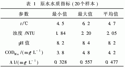 试验用水取自黑龙江省大庆市附近某水库,由于地处北方寒冷地区,冬季冰冻期长达5个月。原水经取水泵加压进入建立在水厂试验室的中试装置中,原水水质见表1,可以看出原水为典型的低温低浊水,并且原水中铝浓度大大超过国家生活饮用水水质标准的0.2mg/L。