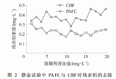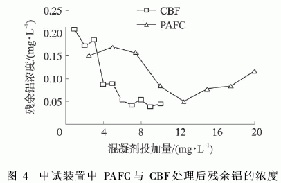 CBF有效地去除了低温低浊水源水中的铝,在与PAFC复配使用时,消除了PAFC引入原水中的铝,降低混凝后出水中残余铝的浓度,并降低了总的混凝剂投药量。