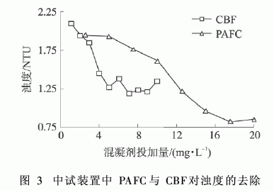 在静态试验的基础上,中试试验PAFC和CBF的最大投药量确定为20mg/L和10mg/L。图3显示了在不同混凝剂投加量下水中浊度的变化规律。
