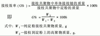 去除均聚物的淀粉接枝共聚物中接枝高分子的质量与淀粉的质量的比值称为接枝率。其测试原理是用酸将已除去均聚物的接枝共聚物中的淀粉水解掉,然后过滤,所得产物即为接枝到淀粉上的高分子物质。