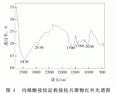 在淀粉水溶液制备体系中,采用硝酸铈铵-过硫酸钾氧化还原体系,利用两者氧化还原产生的自由基,取代淀粉链上的仲碳或叔碳上的氢,生成带有活性点的长链自由基,引发丙烯酸接枝共聚合,得到其接枝共聚淀粉基的絮凝剂。由图1丙烯酸接枝淀粉接枝共聚物红外光谱图可见,丙烯酸接枝淀粉接枝共聚物不但在3428cm-1、1124.47cm-1、1023.47cm-1处出现了纯淀粉的特征吸收峰,在609cm-1处有一醚键的平面弯曲振动峰,而且在1700cm-1处出现明显-COOH的特征吸收峰。红外数据充分证明:丙烯酸确实接枝到淀粉链上,同时证明此分离过程及合成工艺是可行的,可以确实淀粉的部分链结构上的仲碳产生淀粉游离基与丙烯酸发生接枝共聚反应,而且在较低温度下较短反应时间内能够达到较高的接枝率。