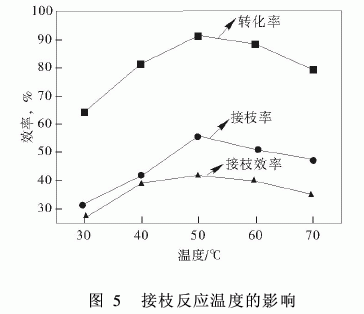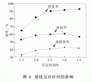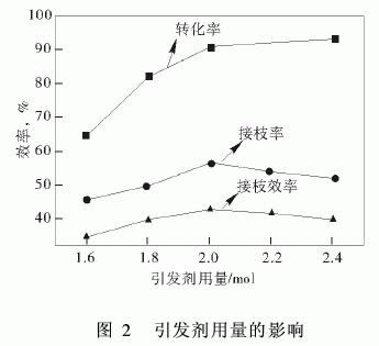 这是由于当引发剂用量增加时,引发剂与淀粉发生反应形成的接枝反应活性中心也增加,而且也使单体上产生的活性中心增加,因此,单体转化率、接枝率和接枝效率随之提高;当引发剂为2.0mmol时,接枝率为43.2%,接枝效率为56.4%;当引发剂用量继续增加时,接枝率和接枝效率均降低。这是由于存在溶液体系中引发剂自由基含量增加,丙烯酸自身均聚的几率也增加,在两种聚合方式竞争中,影响淀粉接枝率,故单体转化率继续缓慢增加,而淀粉的接枝率和接枝效率却随之降低。
