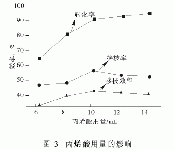 由图3可知,固定其他反应条件不变,随着单体用量的增加,单体转化率、接枝率和接枝效率均增加,在单体用量等于10mL时,接枝率为43.2%,接枝效率为56.4%;当单体用量继续增加时,接枝率和接枝效率均减小,这是由于单体用量增大到一定值后,丙烯酸发生均聚反应的几率增大远远超过其与淀粉接枝共聚合的几率缘故。