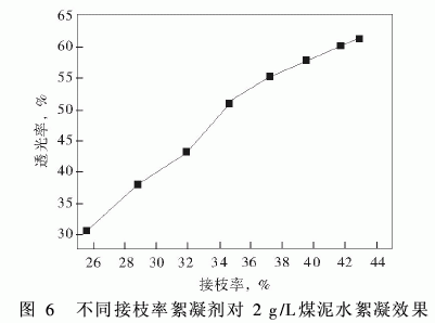 由从图6中可得出不同接枝率对废煤泥水样都有一定絮凝作用,随着接枝率的增大,絮凝效果提高,废水透光度上升。