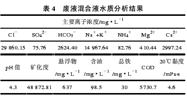 从上述实验结果可以看出,在相同条件下混合废液较单一废液处理效果更好,悬浮物和含油的去除率更高,处理后的混合废液与油田采出水掺混配伍性良好,混合废液的处理效果符合现场生产运行的实际要求。