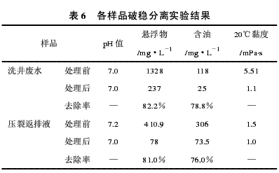 对于钻井作业废液的处理,选用单一药剂、单一工艺流程处理难度很大,通过查阅处理钻井作业废液方法的文献资料[6-8],结合胜利油田各种废液的性质,采用化学破稳分离法对废液进行处理。为了配合化学破稳分离工艺对废液进行处理,结合钻井作业废液的水质特性,复配筛选了复合高效钻井作业废液处理剂ZF-Ⅰ-(A、B、C)、ZF-Ⅱ-(A、B、C)以及废液调节剂。首先对洗井废水和压裂返排液破稳分离实验,结果如表6所示。