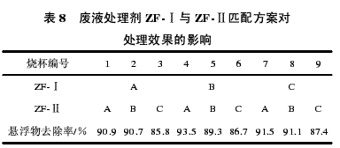 在编号为1~9的九个烧杯中加入已采用调节剂调整pH值至中性的王家岗混合废液样品各100mL,在确定ZF-Ⅰ(-A、B、C)加入量均为300mg/L,ZF-Ⅱ-(A、B、C)加药量均为100mg/L,通过测定处理后悬浮物的去除率来确定两种药剂的最佳使用匹配方案,结果见表8。