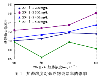 从图1可以看出,ZF-Ⅰ-B的量在300~400mg/L,ZF-Ⅱ-A在70~80mg/L,悬浮物的去除率相对较高,均在90%以上,悬浮物含量可以达到≤45mg/L。