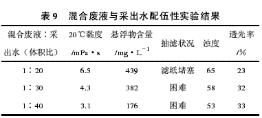 由表9可见,混合废液直接与油田采出水掺混,混合后的污水抽滤困难,会导致滤纸堵塞,污水黏度较高、浊度较大、透光率较低,说明即使掺入2.5%的废液,也会冲击污水处理系统中各处理单元,影响采出水处理效果。