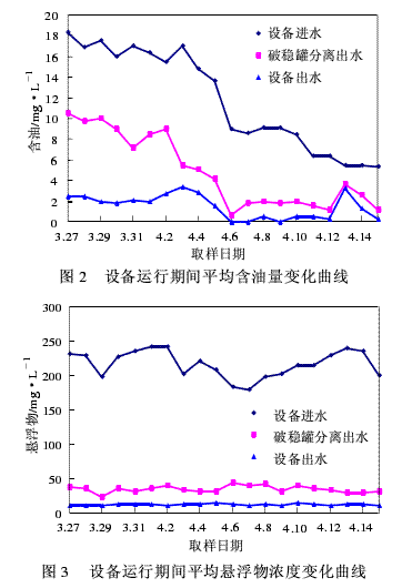 由检测结果图2、图3可见,王家岗污水站混合废液经过装置处理后能脱除水体中的大部分悬浮物,破稳分离罐出水的悬浮物含量均在45mg/L以下,装置出水可以降至15mg/L以下,去除率均在92%以上。现场试验期间,装置进水口的含油范围在5.4~20.8mg/L,波动范围较大。废液经过装置处理后含油基本稳定在3mg/L以下,其去除率均在80%以上,满足进入油田采出水处理系统水质指标要求。