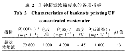 待处理的印钞超滤浓缩废水的各项指标如表2所示。