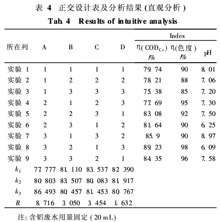 对不同配比条件下制备的絮凝剂,进行絮凝实验,逐渐增加絮凝剂的量,计算出每个絮凝剂的COD、色度的最佳去除率。由于在最佳投药量下,每个絮凝剂对废水色度的去除率均较高,数据的波动较少,故采用COD作为正交实验结果分析的指标。最优投药量为每50mL印钞超滤浓缩废水加入6~7mLω(絮凝剂)=20%的絮凝剂,结果与直观分析结果如表4所示。