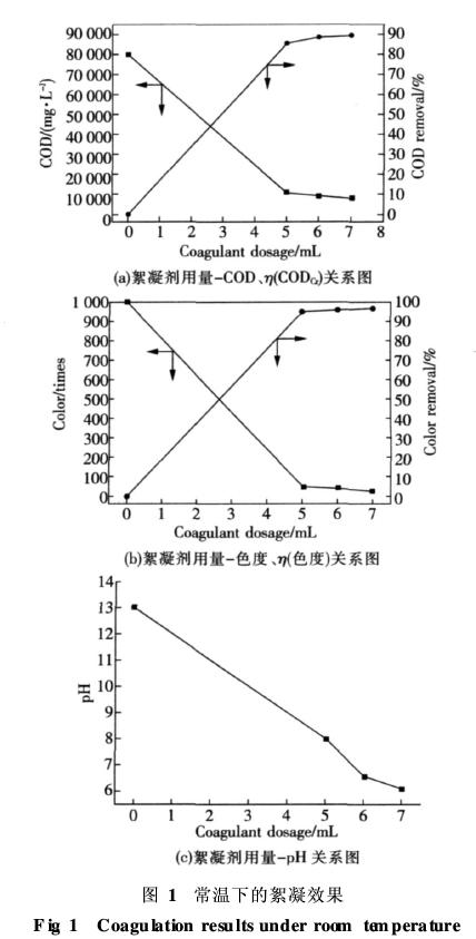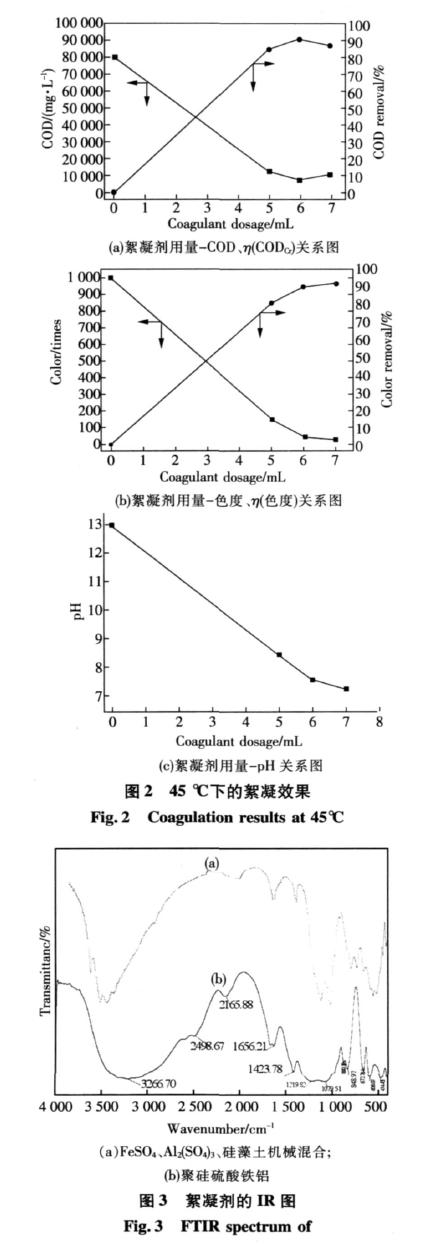 结果表明温度高时,残余色度为20倍无明显改善,但COD的去除率提高到90.73%,剩余COD为7400mg/L,而且加入量也可减少(120mL/L废水),这是由于高温条件下,絮凝剂中的金属离子水解速度更快,同时,絮凝剂水解产物与废水中颗粒物的碰撞更加剧烈,碰撞的几率增大,有利于絮体的生成。