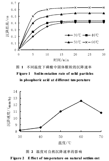 温度对磷酸中的固体颗粒的沉降有双重影响,一方面温度的变化直接导致磷酸粘度的变化,温度降低,磷酸的粘度增加,固体颗粒沉降时阻力增大,因此磷酸粘度增加会延长固体颗粒沉降所需时间,降低沉降速率。另一方面,温度又对磷酸中杂质的溶解度有很大影响,温度越低,杂质的溶解度越低,有利于沉淀的析出,加速沉淀的生成速度。