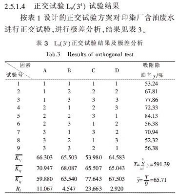 极差Rj的大小反映各因素水平变化对吸附除油率的影响,极差越大说明这个因素的水平改变对试验结果的影响越大,由此得出因素的重要性次序为:C>A>B>D,对含油废水处理效果最佳的方案是A2B2C3D3。因已做的正交试验不包括最佳方案,因此按最佳方案即在温度为35℃、pH值为9、丙纶吸油毡用量为1.5g、吸附时间为1h的条件下吸附处理200mL含油废水,得到吸附除油率为87.12%,出水含油量低于10mg/L。为了降低试验误差的影响,利用极差分析求出最优方案的工程平均,得到A2的水平效应a2=5.237,B2的水平效应b2=2.377,C3的水平效应c3=11.933,D3的水平效应d3=1.793。最优方案A2B2C3D3的工程平均为y优=87.05%,比已做过的9个试验中最高去除率的第5号试验的试验结果84.13%还要高,从另一个角度说明确定方案A2B2C3D3为最优方案是正确的。